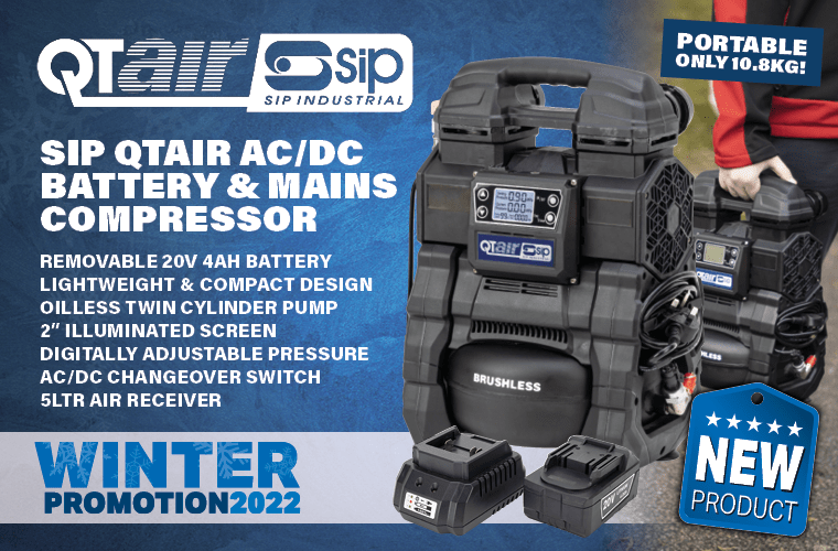 The newest arrival is the SIP QT AC/DC Battery and Mains Oilless Compressor, an innovative and versatile machine that not only offers portable air from a lightweight and compact design, but does not compromise its heavy-duty nature or robust components.